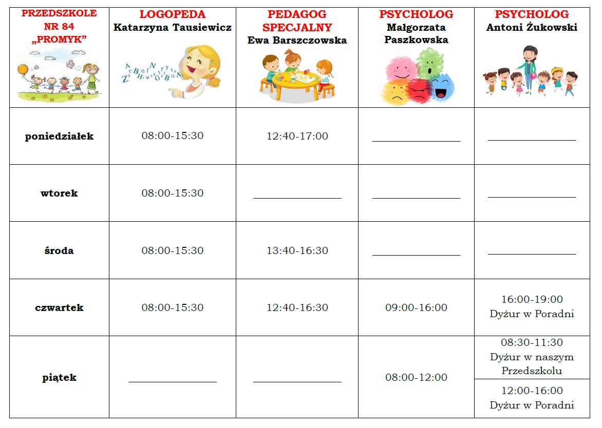 - specjaliści wykonujący w przedszkolu zadania z zakresu pomocy psychologiczno-pedagogicznej: